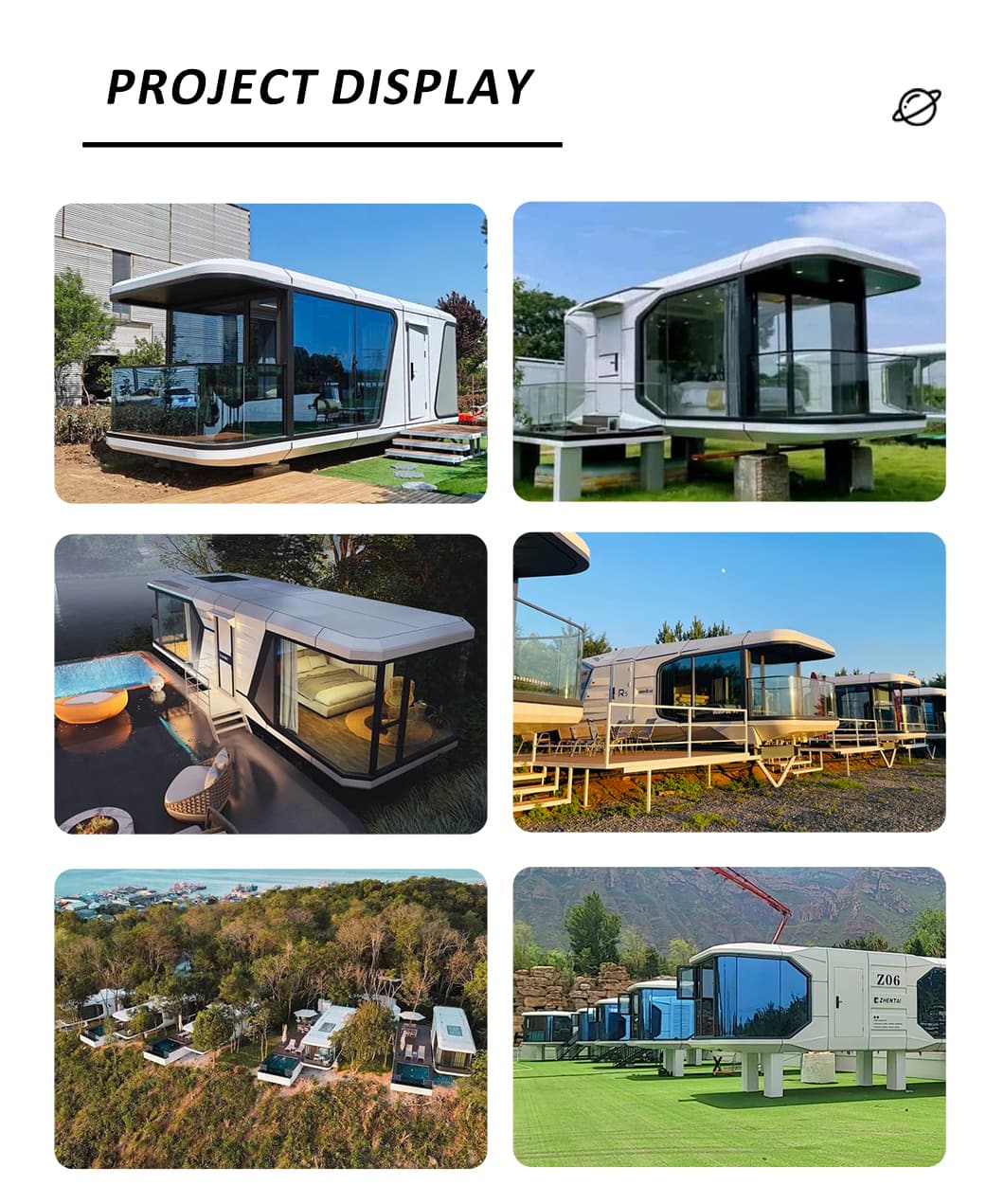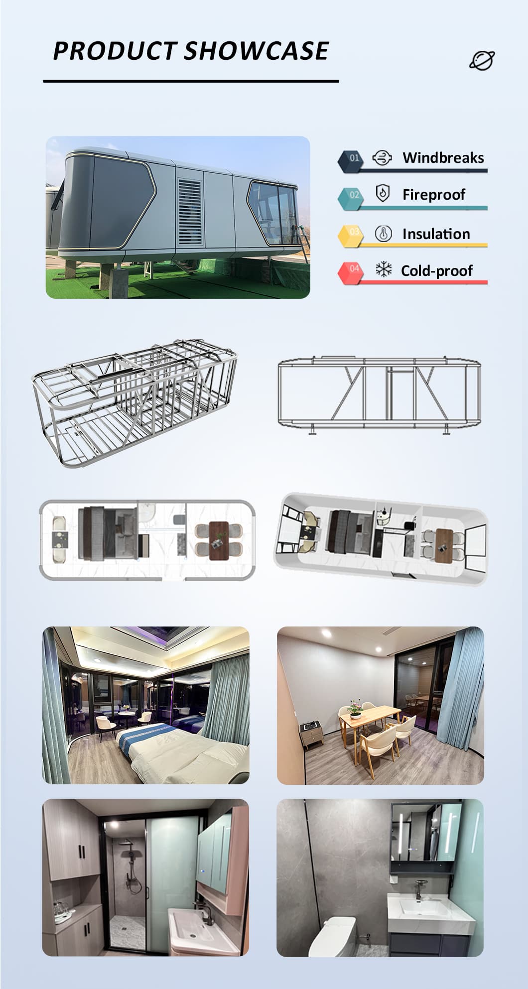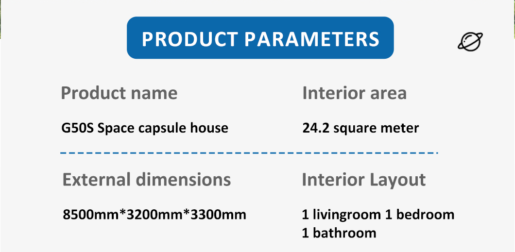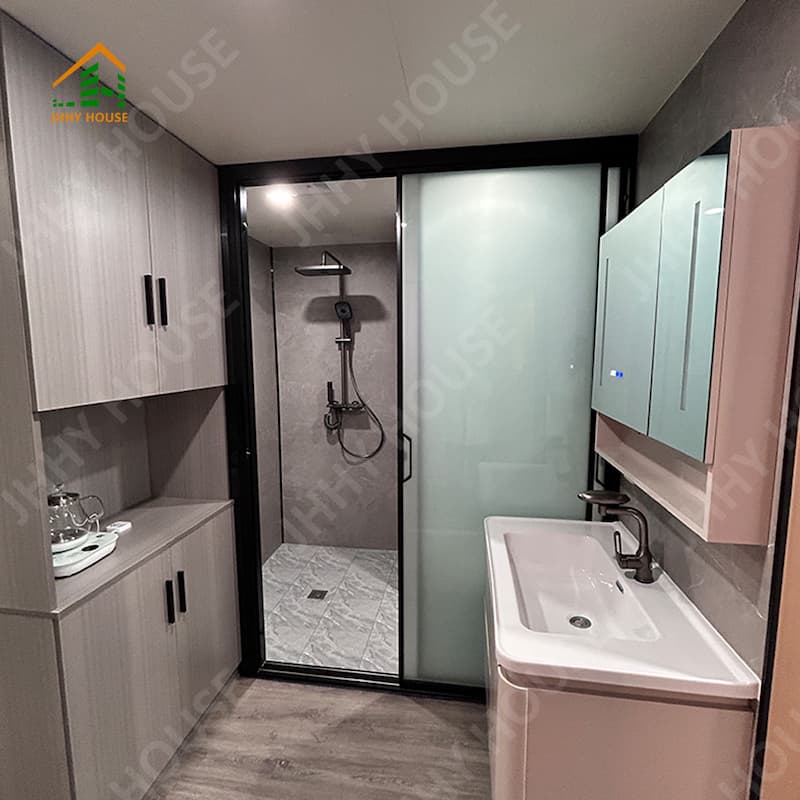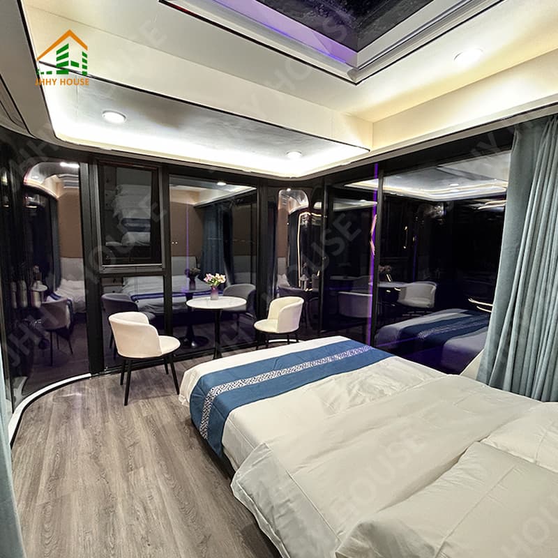 | Innenausstattungssystem | Abgehängte Decke (OSB-Platte + Kohlefaserplatte) Innenwandoberfläche (OSB-Platte + Kohlefaserplatte) (Platte + Kohlefaserplatte) Innenbodenbelag (SPc-Klickboden) Fußbodenheizungssysteme Badezimmertür (Sichtschutz-Schiebetür aus Glas) Waschbecken (Marmor, individuell angefertigt) Badezimmerwände (SPC-Verbundplatten) Badezimmerboden (Fliesen) Möbel wie Betten, Nachttische, Sofas usw. (können individuell angepasst werden) |